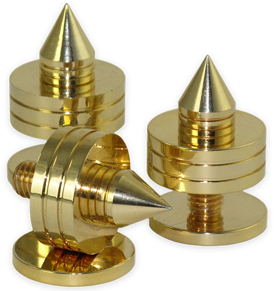 Then a precision-machined spiked brass cone dissipates the energy away from the platform into the layer below it. There are three cones, arranged in a mathematical arrangement designed to drain the maximum amount of stored energy. To protect the furniture surfaces, it comes with small solid brass coins or feet.